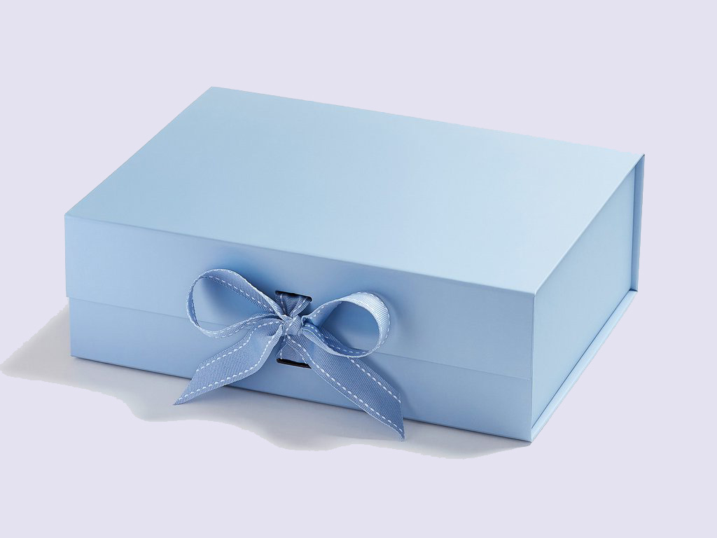 Our luxury Light Blue A4 Deep Gift Boxes with Changeable ribbon are ideal for skincare, super food hampers, garments, infant and wedding endowments.