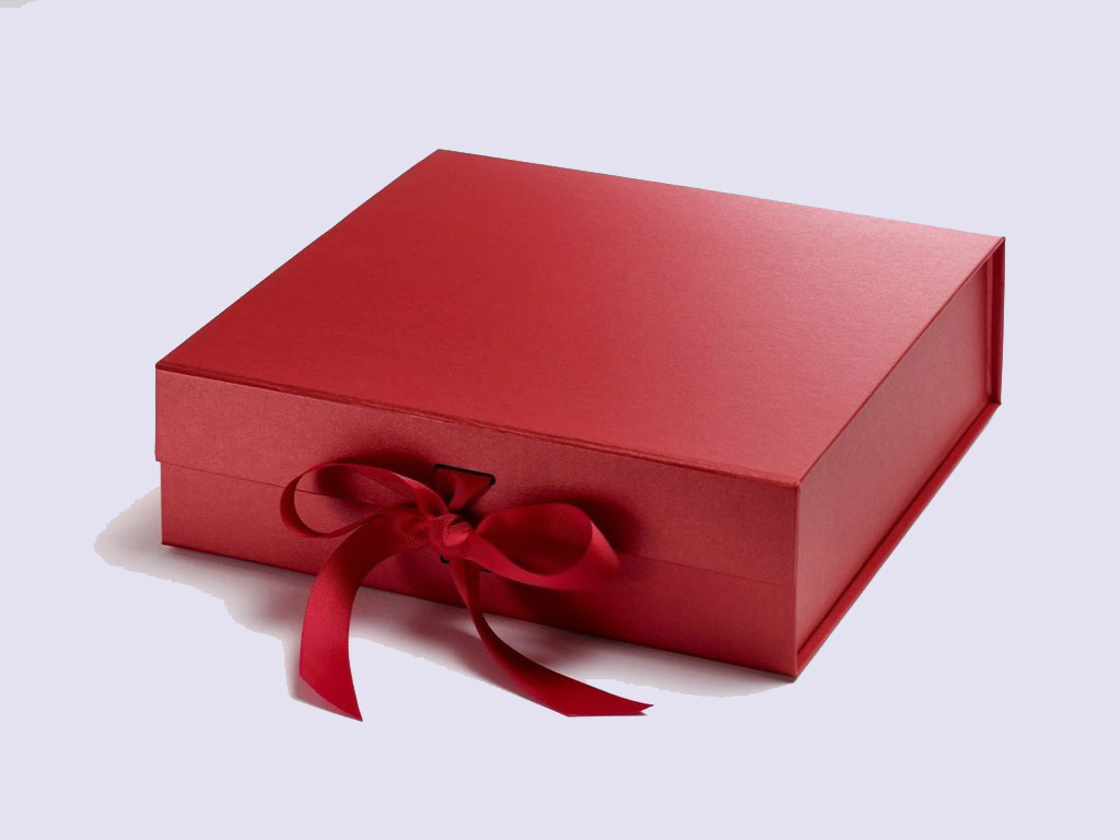 Red Large Gift Boxes with changeable ribbon by Rigid Boxes does make a strong style statement with elegant red color. A perfect choice for a love gift representing your true feelings. Print your custom message on the box and let your loved one know what you think of them.