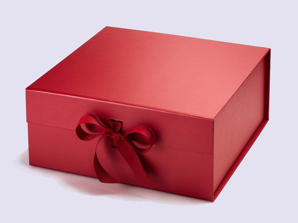 Red XL Gift Boxes with changeable ribbon by Rigid Boxes does make a strong style statement with elegant red color. A perfect choice for a valentine or anniversary gift for your loved ones. Print your custom message on the box and let your loved one know what you think of them.