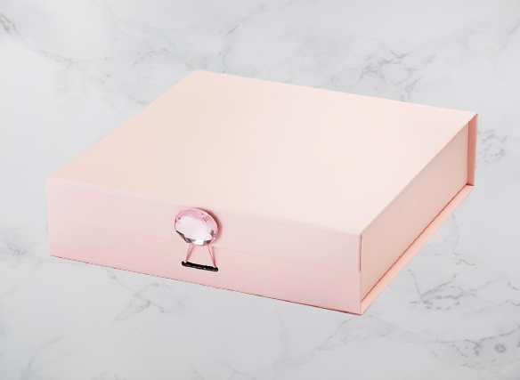 This luxury rose quartz gemstone gift box closure come with a pale pink elastic cord loop that can help you attach it easily to your slot gift boxes. Order today from Rigid Custom Boxes and get quick shipping for your order.