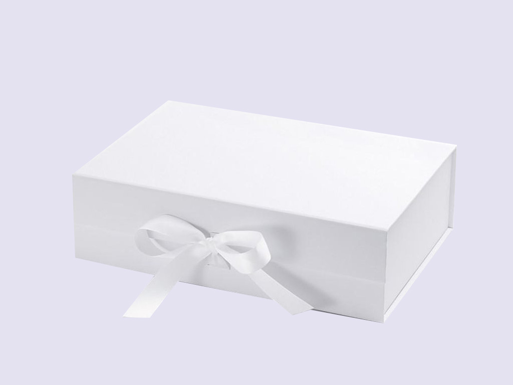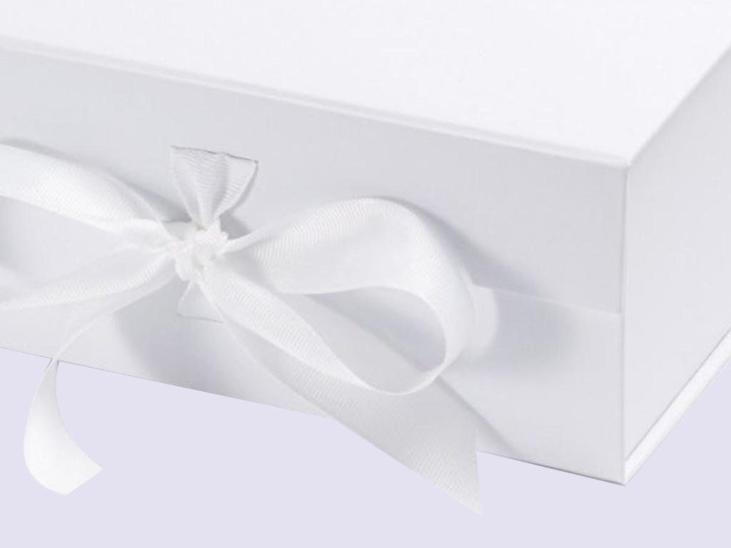 Our customisable White A4 Deep gift boxes with fixed grosgrain ribbon ties make the perfect presentation hamper box, for gourmet foods, beauty products, clothing, lingerie and on-line gift-wrapping services.